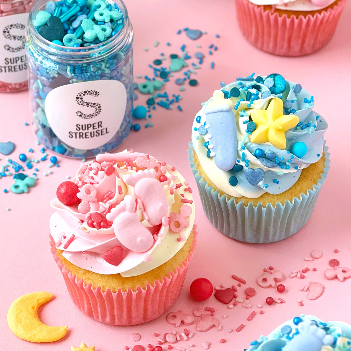 Jedes SuperDing ist selbst designt, von Hand gespritzt und bemalt worden (jaaa, alles von Hand gemacht! Nix Maschine!). Im Set KleinesWunder warten ein blauer Wal, ein niedlicher Strampler, ein Babyfläschchen, zwei Wölkchen, ein Mond, ein Sternchen und zwei süße Babyfüßchen darauf, deine Cupcakes zur Babyshower oder deine Torte zur Gender Reveal Party zu verschönern.