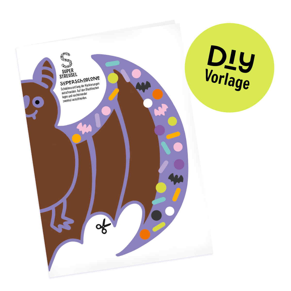 Unsere 2 in 1 DIY Vorlage ist Schnittvorlage für den FledermausKuchen und CakeTopper Malvorlage zugleich! Einfach die Fledermaus ausschneiden, auf den Blechkuchen auflegen, mit einem Messer zurechtschneiden und danach als Malvorlage verwenden.