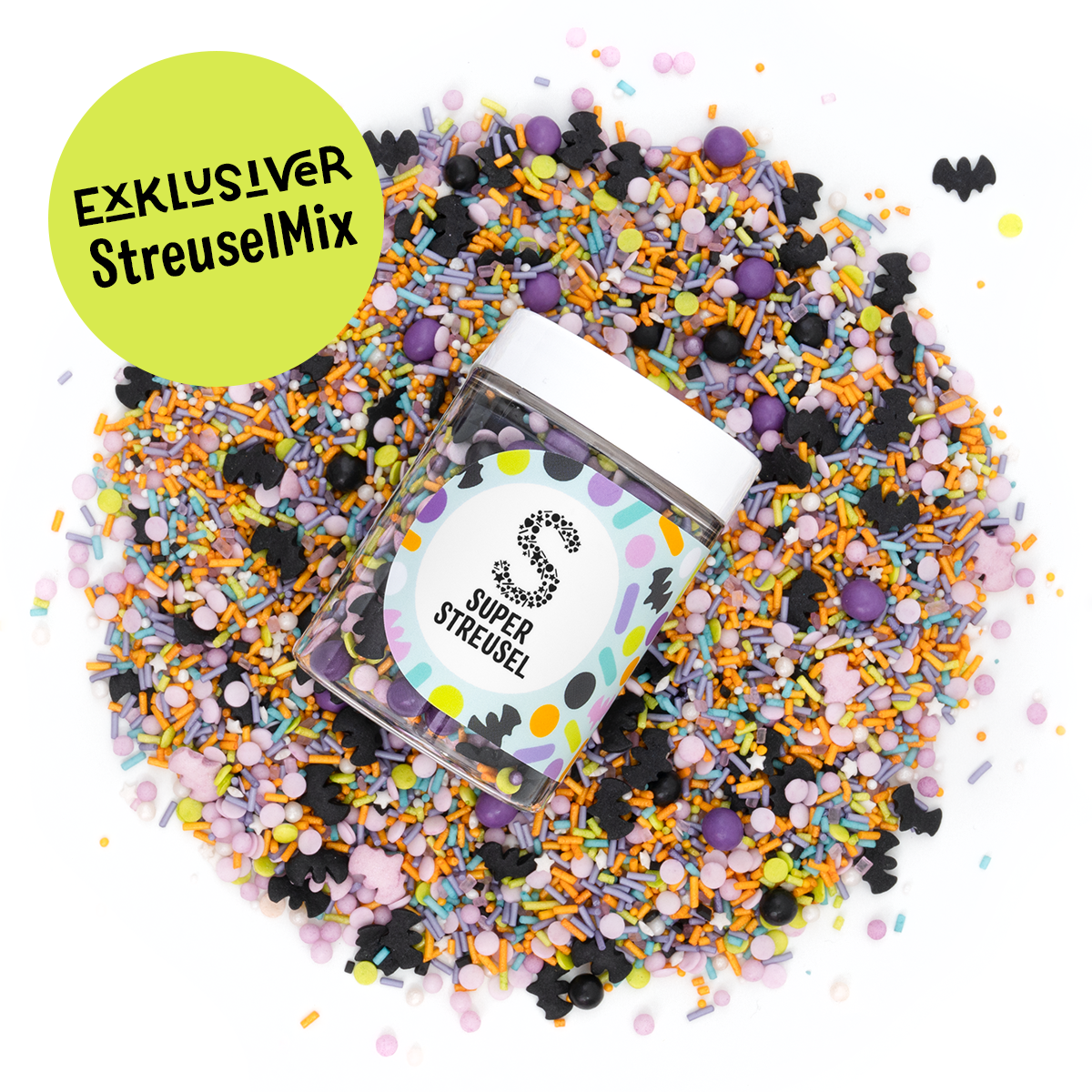 Unsere “FlatterFreunde” sind los! Ein StreuselMix wie aus der Geisterbahn, mit Fledermäusen in Schwarz & Flieder, dazu crunchy MiniKnusperkugeln in Lila & Schwarz zwischen KonfettiStreuseln in Grün, Orange, Flieder und Türkis.