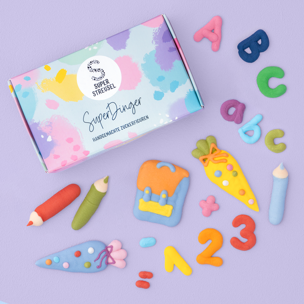 Jedes SuperDing ist selbst designt, von Hand gespritzt und bemalt worden (jaaa, alles von Hand gemacht! Nix Maschine!), und mit diesem Einschulungs-Set wird dein Buffet zur Einschulung nur so strotzen vor ErstklässlerEnergie! Mit essbaren 123, zweimal ABC, drei Stifte, zwei Schultüten, ein Schulranzen, Plus-, Minus- und Gleichzeichen pimpst du deine Torte und Cupcakes im Handumdrehen und hast die perfekte Deko zur Einschulung.