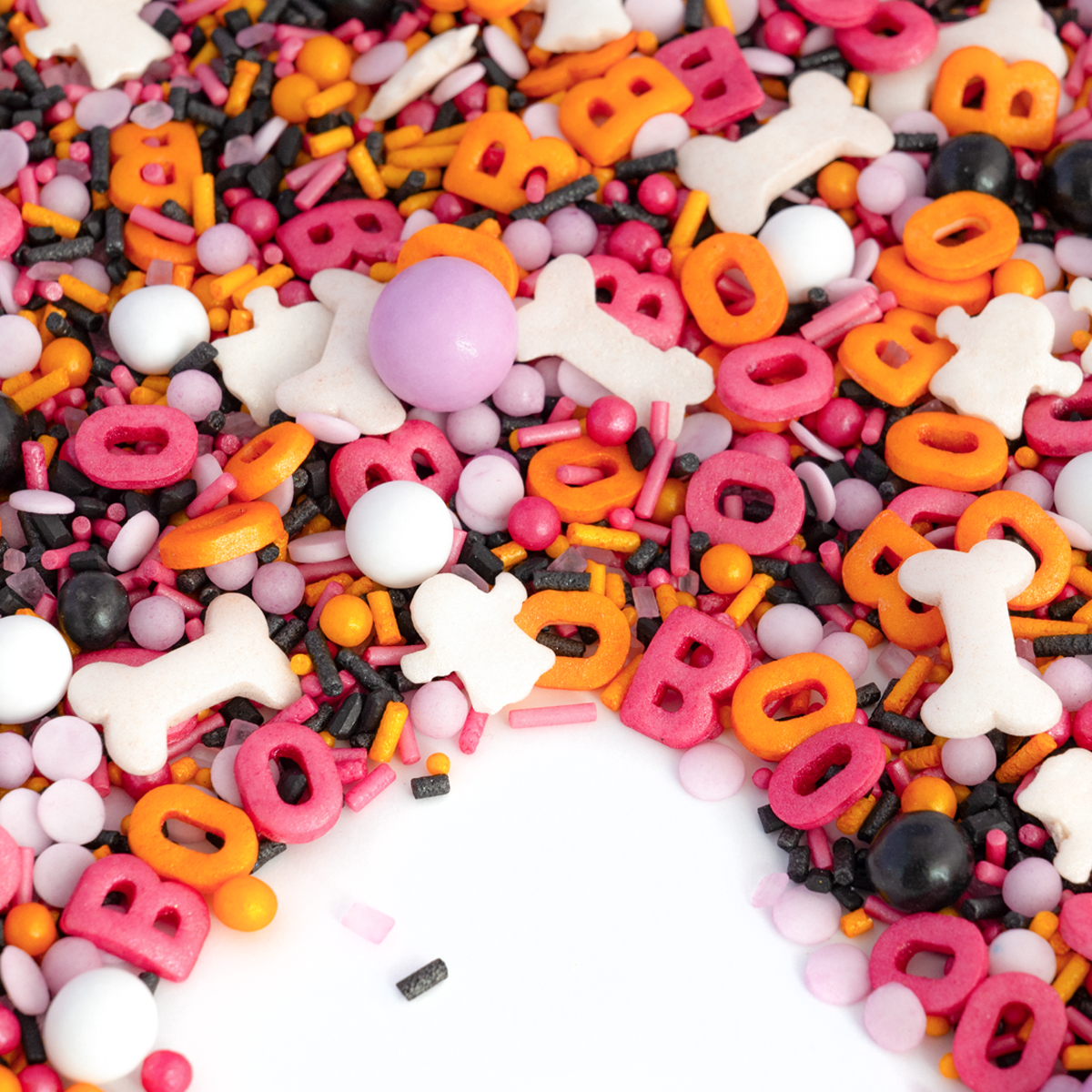 In BOOOO! steckt alles, was dein Gruselherz höherschlagen lässt: freche BOOOO-Buchstaben in Orange und Pink, weiße Knochen und spuuuukige Geister, fliederfarbene Schokokugeln, MiniKnusperkugeln in Weiß und Schwarz sowie ein kunterbunter Mix aus Zuckerstreuseln, Nonpareilles und Konfettistreuseln in Orange, Schwarz, Pink und Flieder. Perfekt für HalloweenTorten, Cupcakes oder als freches Streusel-„BOOOO“ mitten im Alltag. Mit BOOOO! wird’s bunt, knusprig und herrlich gruselig!