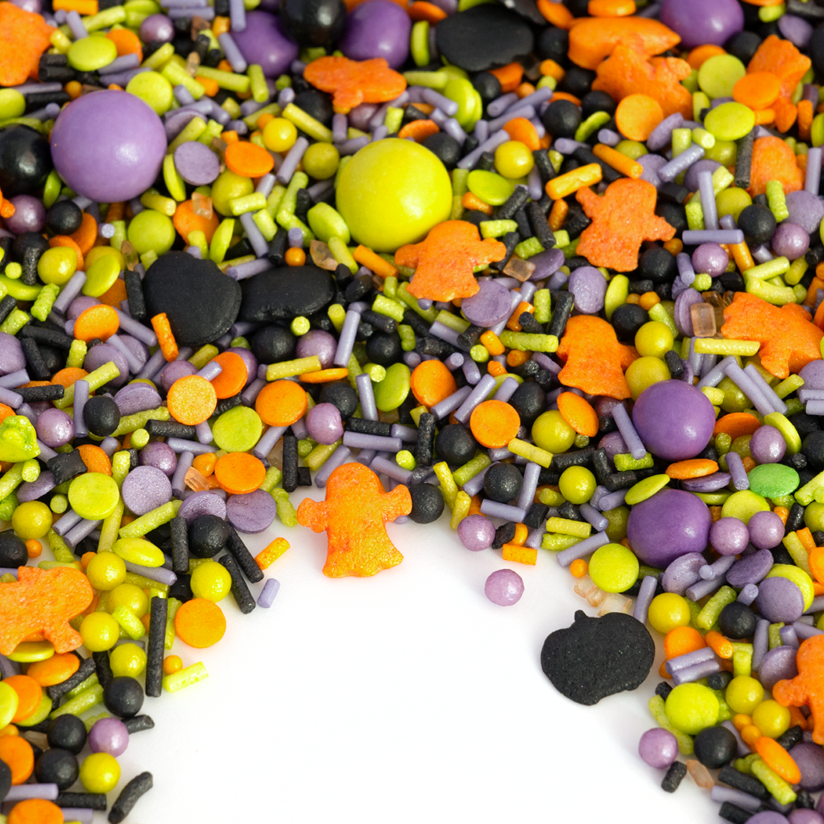 SchauderSchreck bringt alles mit, was dein Gruselherz begehrt: orangene Geister und schwarze Kürbisse, lilafarbene und grüne Schokokugeln, kleine lila MiniKnusperkugeln und freche KonfettiStreusel in Lila, Grün und Schwarz – alles handvermischt für den perfekten Gruselglanz.