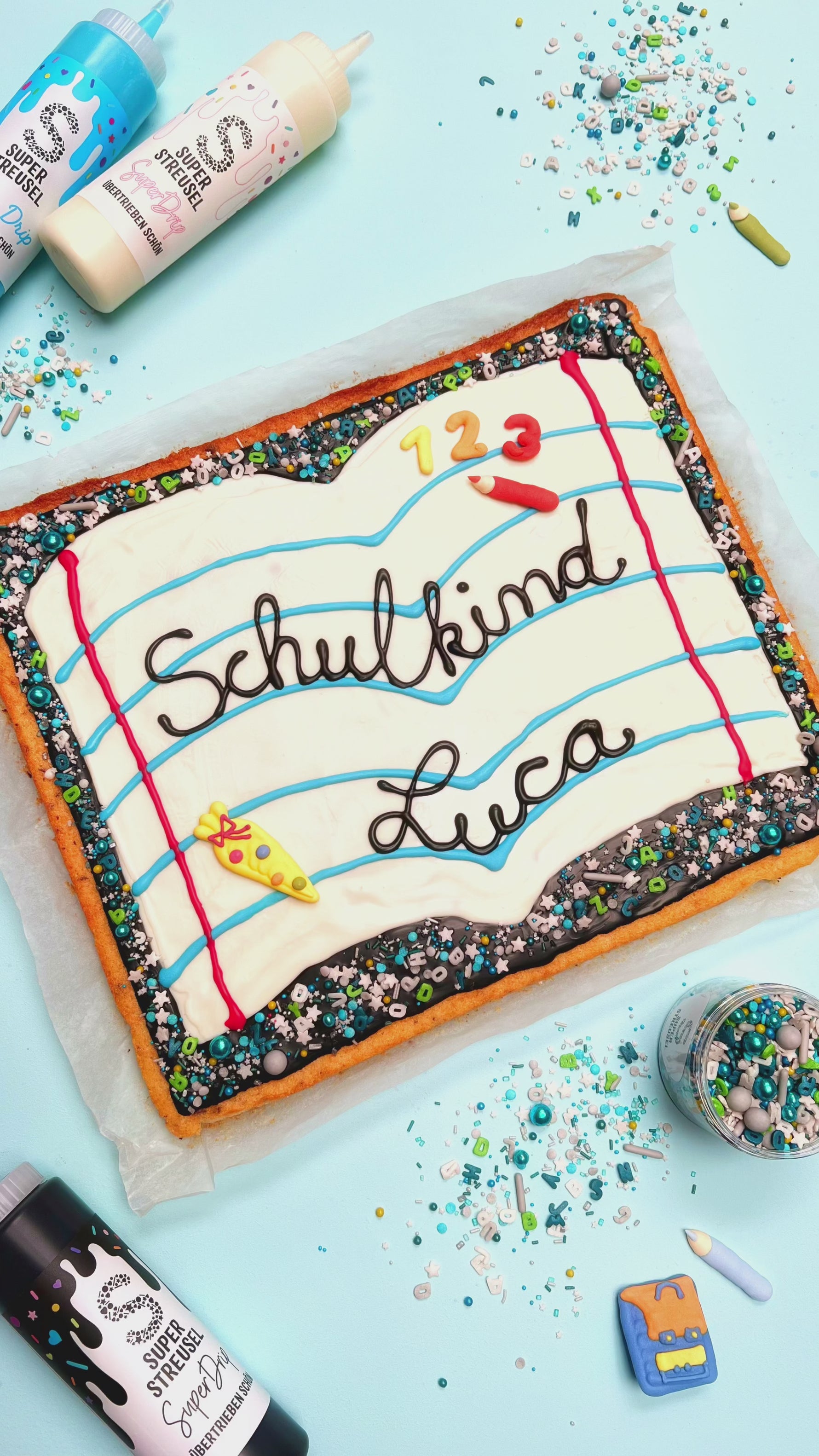 Juhuuuu – erster Schultag! Das muss gefeiert werden – mit einem suuuuperleckeren und kunterbunten KuchenBuffet! Mit GroßePause wird die EinschulungsTorte garantiert der Oberhammer! Mit all den süßen BuchstabenStreuseln kann das frischgebackene Schulkind dann auch direkt schon das ABC üben: A wie Apfelkuchen, K die Keks und S wie Super Streusel!