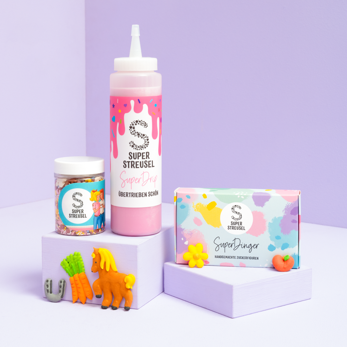 Hüüühh und YeeHaw da werden ja die Pferde im Stall und die StreuselMixe in den Regalen verrückt. Die drei Produkte, die auf keinem PferdeKuchen, auf keinen PferdeCupcakes, auf keinen PferdeKeksen und auf einfach nichts Essbarem, was mit Pferden zu tun hat, fehlen dürfen. Wie obersupermegapraktisch ist das denn? Wir haben quasi das Nonplusultra Survivalpaket für alle PferdeFans. Der nächste Kindergeburtstag, die nächste Mottoparty, jetzt kann alles kommen. Wir sind gewappnet und bereit mit Gebäck im PferdeStyle die Welt zu begeistern.