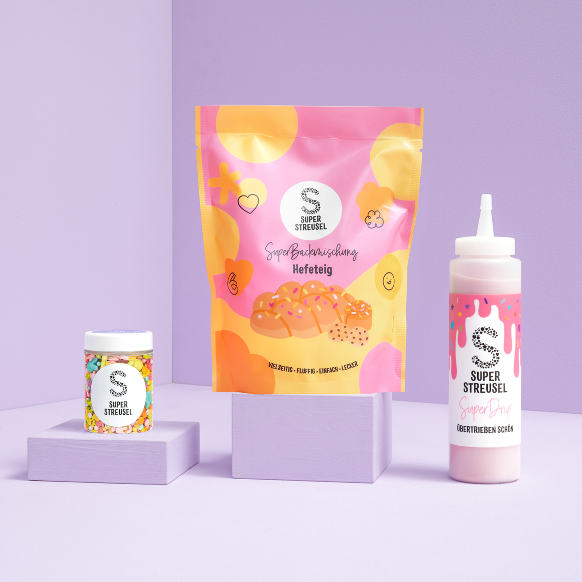 Jetzt kann an Ostern nichts mehr schiefgehen! Mit dem HefezopfSet zauberst du den schönsten Hefezopf, der deine Liebsten garantiert aus den Socken hauen wird. Im Set ist unsere HefeteigBackmischung, mit der du supereasy den fluffigsten Hefezopf backen wirst. Dazu gibt´s rosa SuperDrip und StreuselMix MeinNameIstHase – die perfekte Kombi, um deinen Hefezopf kunterbunt, österlich aufzupimpen. So schick war dein Ostergebäck noch nie!