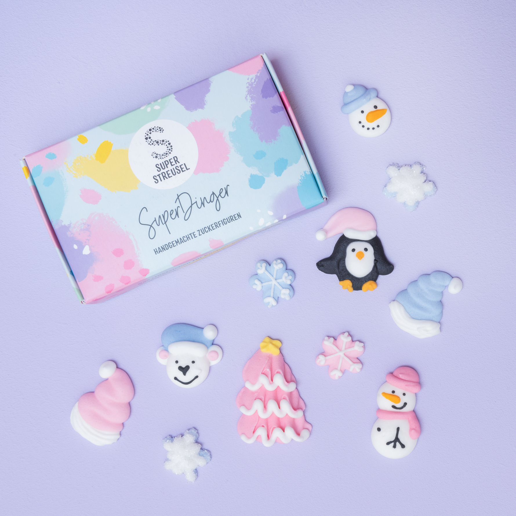 Jedes SuperDing ist selbst designt, von Hand gespritzt und bemalt worden (jaaa, alles von Hand gemacht! Nix Maschine!). Mit diesem süßen WinterSet mit Pinguinen, Schneemännern, Schneeflöckchen und Wintermützchen wirst du dein Gebäck ruckzuck in ein Winterwunderland verwandeln.