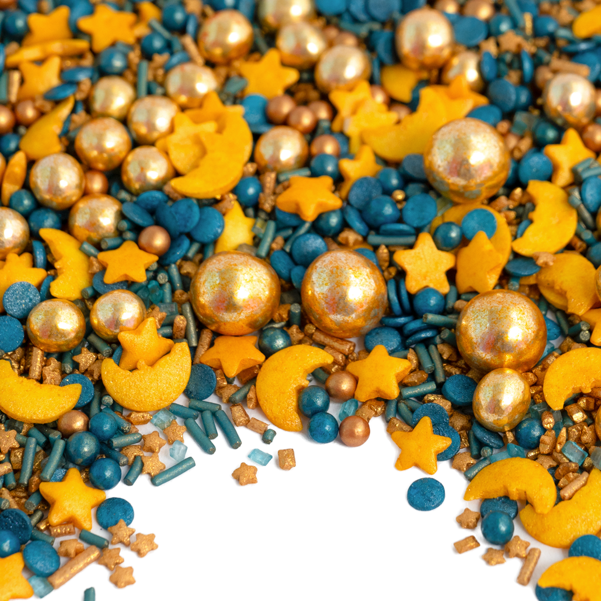 Hier funkeln gelbe Mond- und SternStreusel, goldene Schokokugeln und goldene mini Knusperkugeln zusammen mit tiefblauen KonfettiStreuseln und kupferfarbenen KügelchenStreuseln – woooow, suuuuper edel!