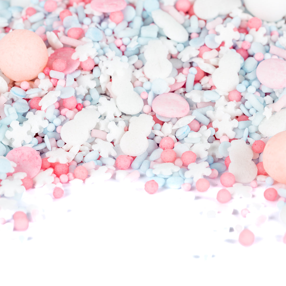 Schön verspielt und einfach nur suuuupersüß! Unser "Flöckchen" enthält kleine weiße Zuckerstreusel in Form von Schneemännern und Eiskristallen, winzige Zuckersternchen und -perlen, -streusel, konfetti und leckere