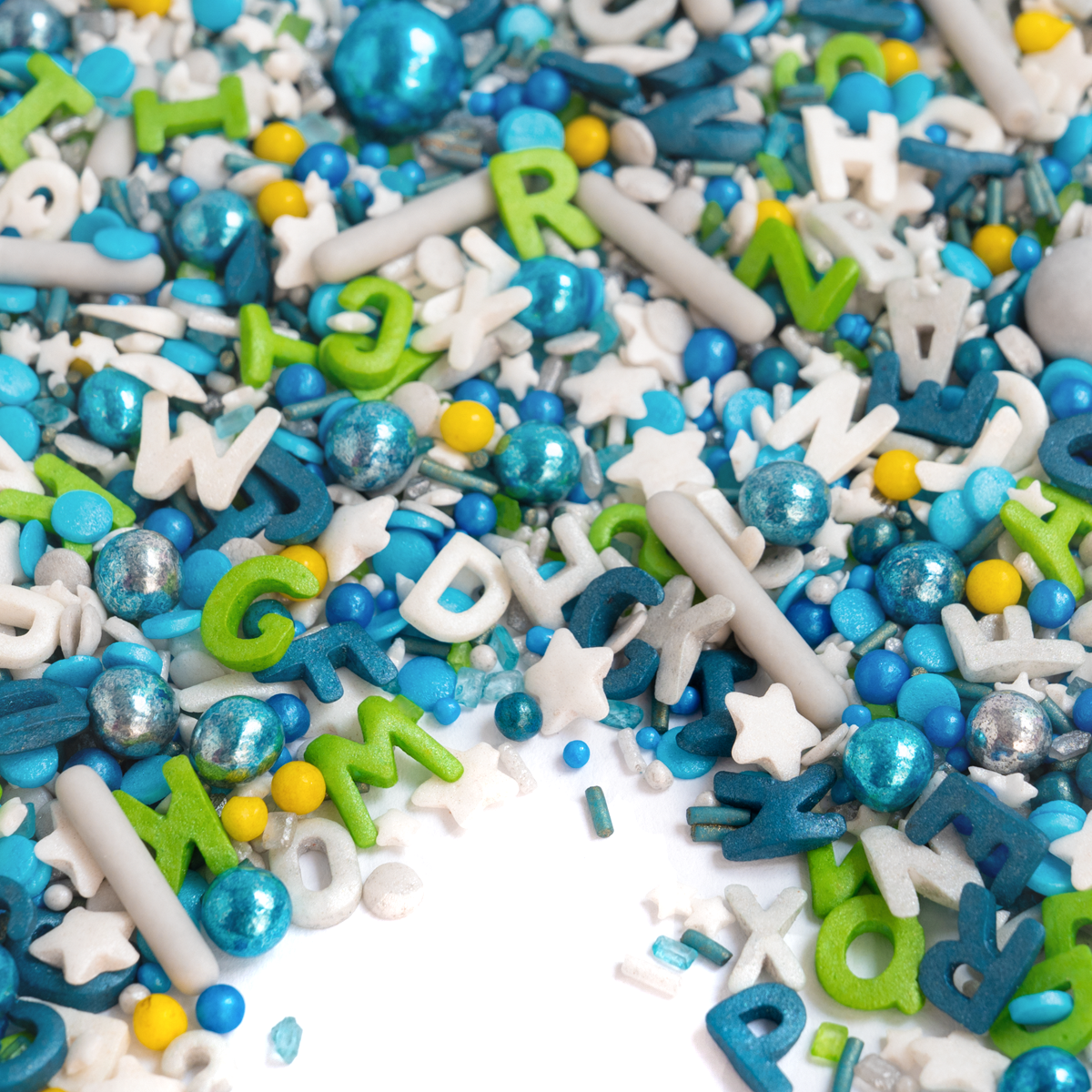 In dieser StreuselDose tummeln sich die Farben Weiß und glänzendes supermetallisches Blau, Silber und gelbe Akzente in Form von großen und kleinen Schokokugeln, Zuckersticks, KonfettiSternchen und Konfetti- und Kügelchenstreuseln. Und das Beste: Buchstabenstreusel! Wie süß ist das denn? Da will man direkt selbst noch mal eingeschult werden.