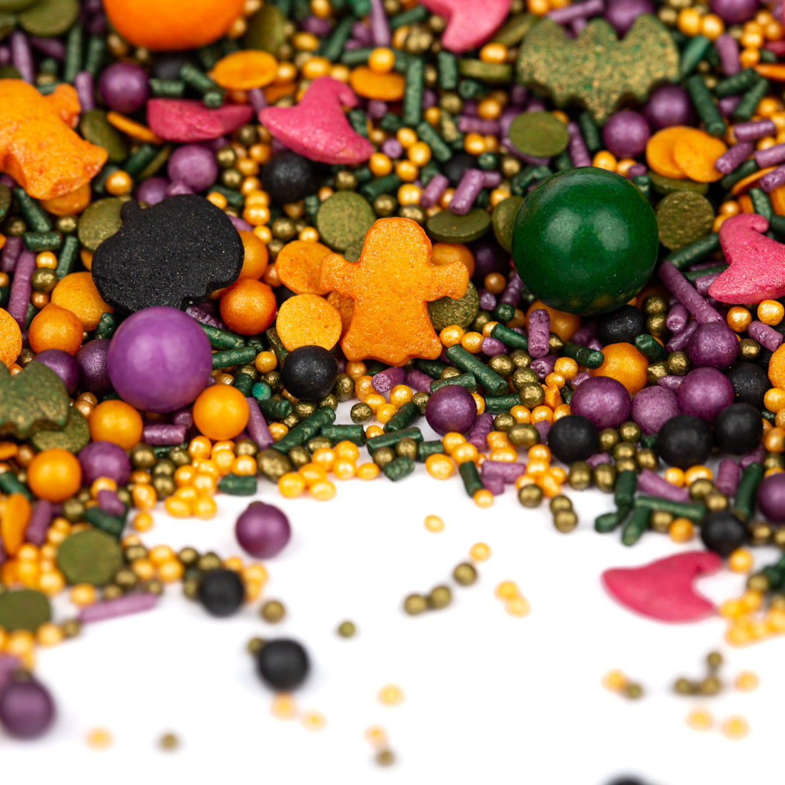 Buhuu, Buhuu, lasst es gruseln und spuken im ganzen Haus. Wenn die Turmuhr zur Geisterstund schlägt und sich die Hexen auf ihre Besen schwingen, dann ist Zeit für eine unheimlich leckere HalloweenParty. Orangene Gespenster, olivgrüne Fledermäuse und pinke Hexenhüte lassen eure GruselTorten schaurig schön ergruseln. Dazu zarte Schokokugeln in Lila, Grün und Orange, noch ein paar KonfettiStreusel und KügelchenStreusel in Lila, Orange, Schwarz und Dunkelgrün. Schon ist der GruselLook perfekt.