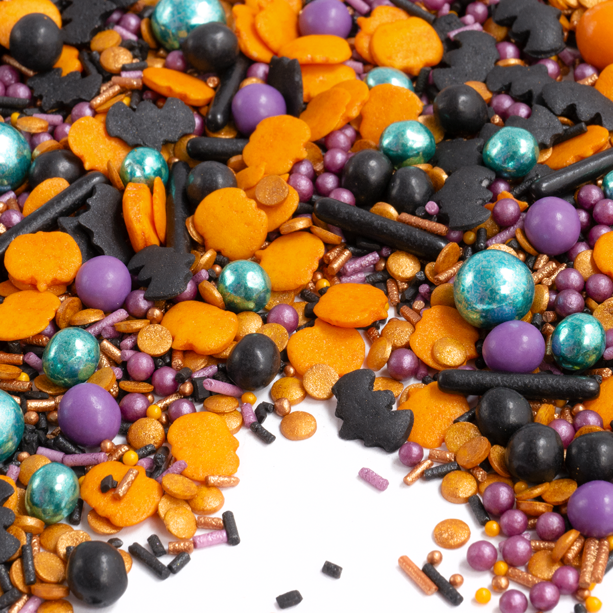 In HexenTanz tummeln sich: Schokokugeln in Orange und Blaumetallic, schwarze Zuckersticks und jede Menge an KonfettiStreusel, KügelchenStreusel und Nonpareilles in Orange, Lila und Schwarz.