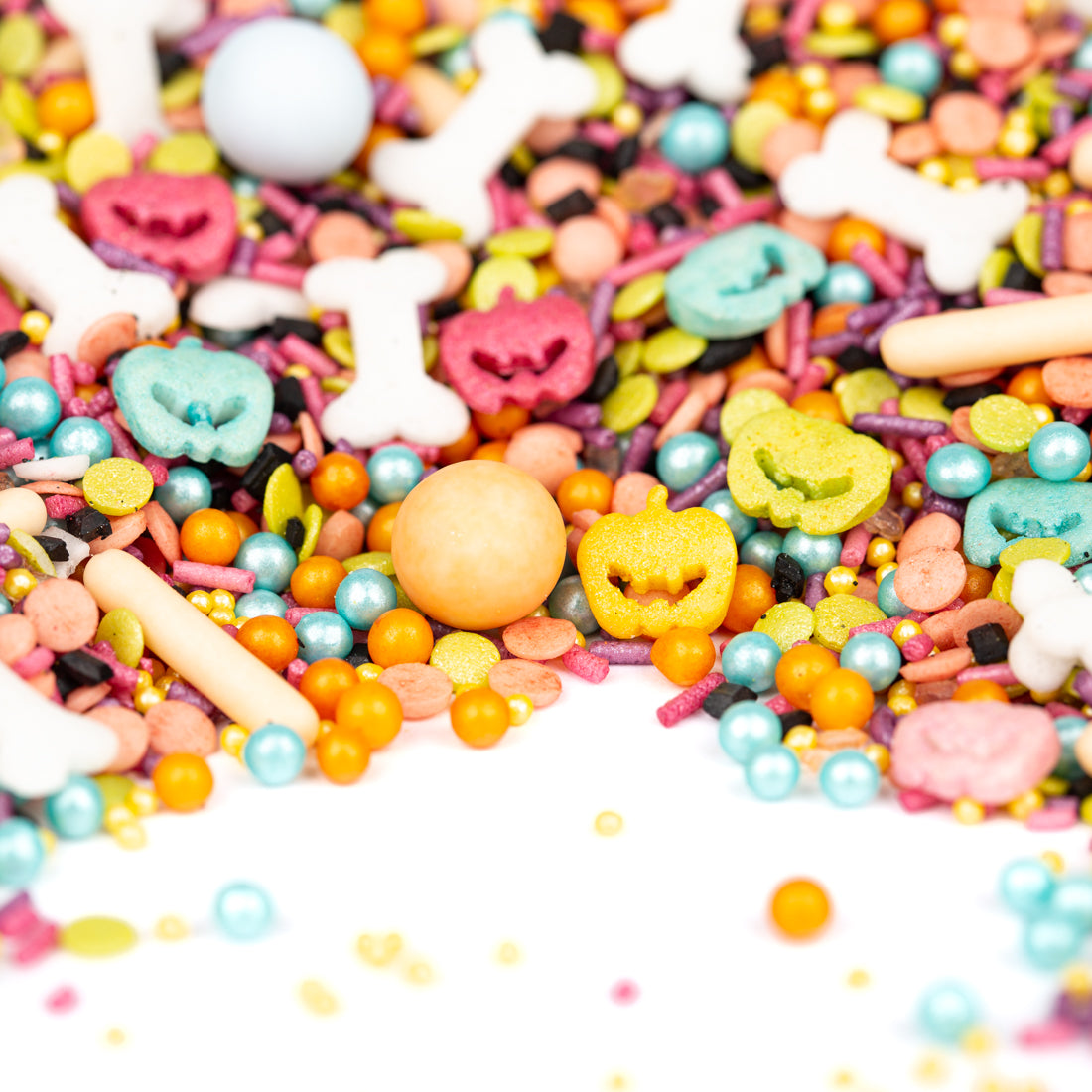 Es muss ja nicht immer die maximale Gruseligkeit sein an Halloween, es kann ja auch mal ne kunterbunte Gruseligkeit auf der Skala des Grusels sein – und genau deswegen haben wir “Kürbissimo” erfunden! Der bunteste aller Halloween Super Streusel Mixe mit einer ganzen Armee superbunter Kürbisstreusel. Hihi, aber keine normalen Kürbisse, sondern Kürbisse mit eingeschnitzter GruselFratze.. Buhuuuuu.. Also doch! Und dazu ein paar herrenlose Knochenstreusel, kombiniert mit fröhlich poppig zarten Schokokugeln... so buntgruselig war Halloween doch wohl noch nie!