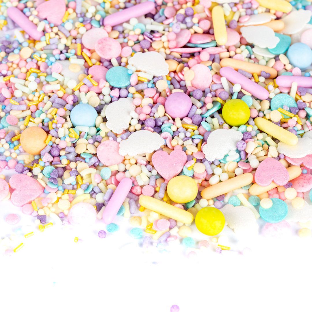 Einmal eingestiegen dreht sich das streuselige PastellKarussell nonstop und vor lauter Niedlichkeit weiß man nicht, wo dieser Streuselmix zuerst hingestreuselt werden soll - auf die EinhornCake Pops? Die pastellige WolkenTorte oder die fluffig weiße Schokomousse zum Dessert? Die Kombi aus rosa, hellblau, gelb und flieder Streuseln katapultiert uns in Sphären unglaublicher Pastelligkeit, umrahmt von weißen Wolkenstreuseln, die den Weg ins Land der frohlockenden Super Streusel weisen. Kurz gesagt: im PastellKarussell fährst du immer richtig, wenn es auf deinen Backwerken stylemäßig steil bergauf gehen soll!