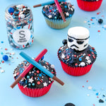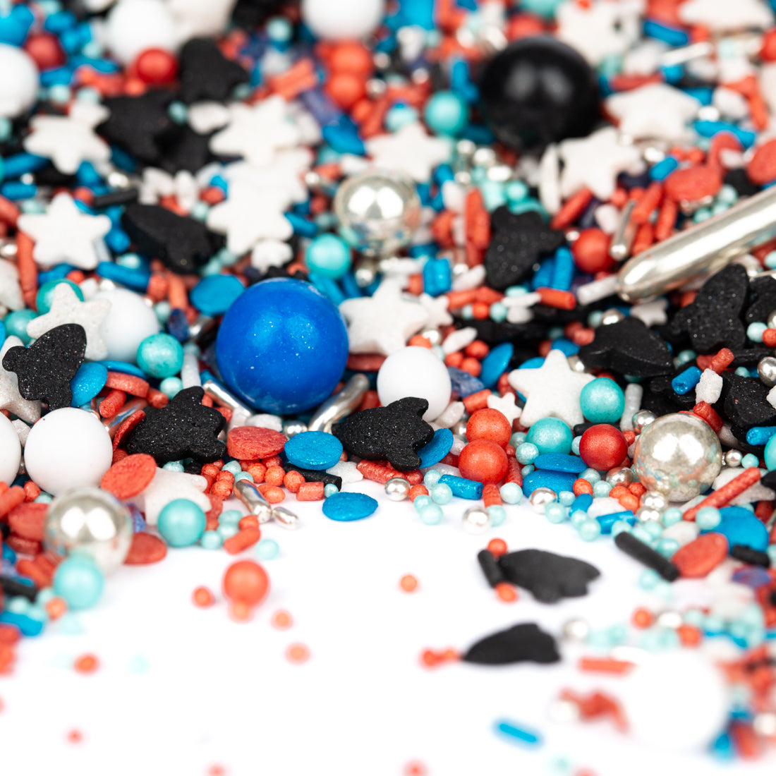 Dieser Zuckerstreusel-Mix goes out to all the Raketentüftler, Legobauer, Astronautenanwärter, Weltraumfans und Partygranaten in der Galaxis. Deswegen haben wir extra viele rockige Streusel reingemischt: blaues Konfetti, blaue Zuckerstreusel, große zarte Schokokugeln in blau und raubeinigem schwarz, rote Konfettistreusel, silberne Perlchen und silberne Zuckersticks. Als harmonische Abrundung noch ein paar große weiße Zuckersterne aus dem Weltall und zarte weiße Schokokugeln. Und gaaanz neu dabei: Raketenstreusel!! Also ganz ehrlich, wer schnallt sich da nicht sofort den Astronautenanzug und stellt sich an den Backofen um die nächsten raketenmäßigen Partykuchen zu backen? 3-2-1, Lift off!