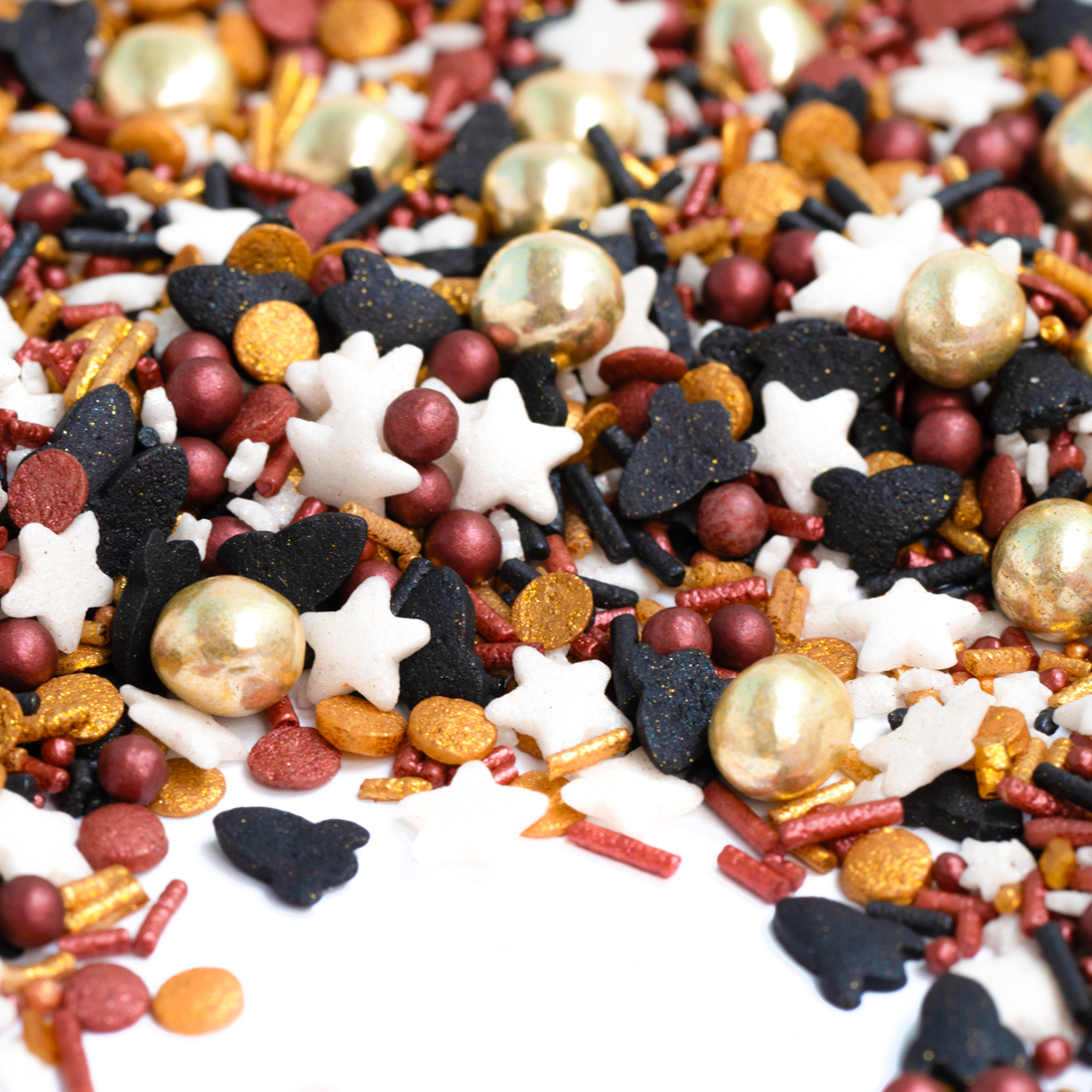 Edles bordeauxrot trifft hier auf goldiges Gold und schickes Schwarz, dazu habt ihr euch weiße Sternstreusel, Raketenstreusel und goldene Schokokugeln gewünscht - was für großartige Wünsche, denn das Ergebnis ist rossketig wow! Damit veredelt ihr zu hundert Prozent jeden süßen SilvesterSnack in ein raketenmäßig geniales HinguckerTeil. Ne richtige RossKete eben!