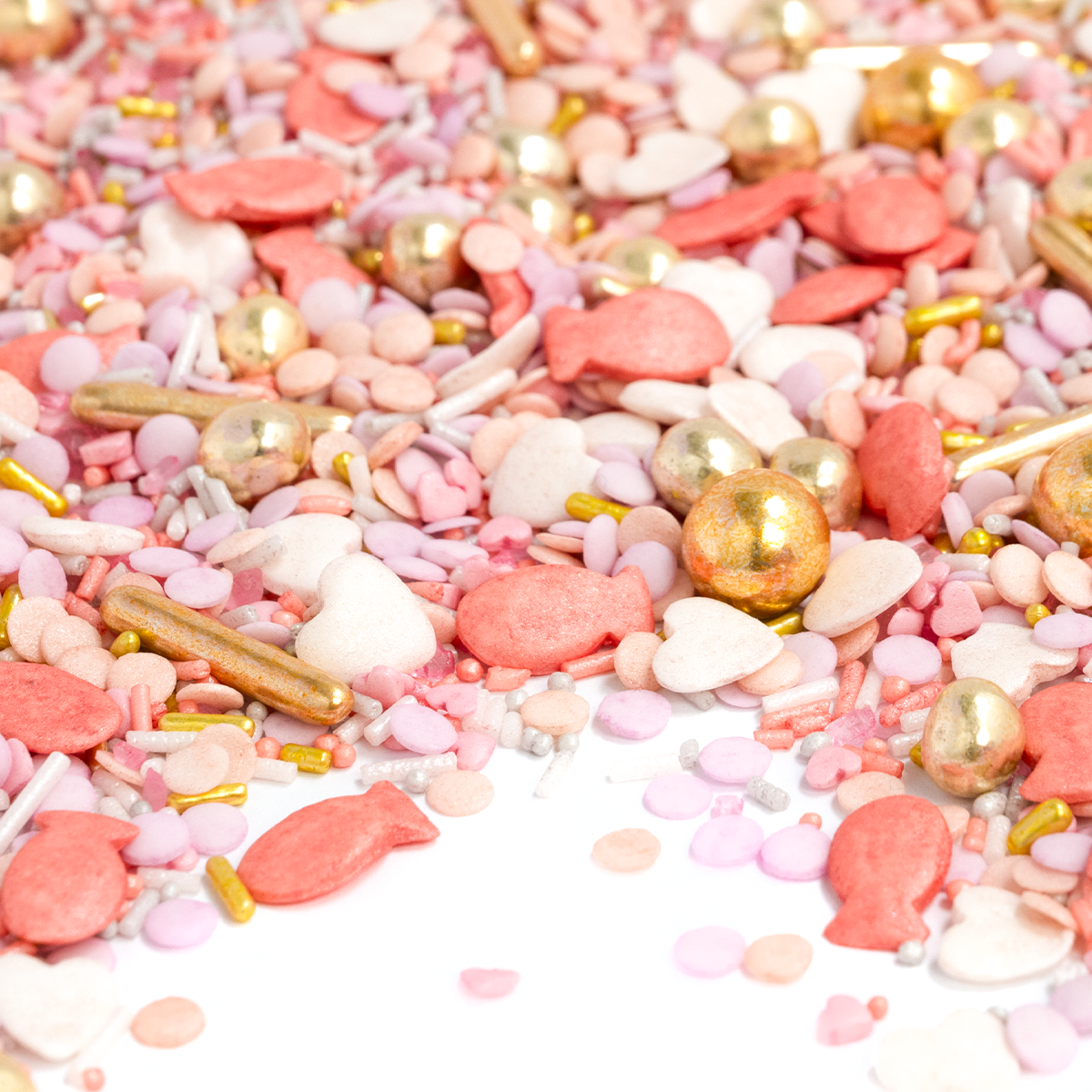 Wenn's was zu feiern gibt, dann dürfen Super Streusel auf keinen Fall fehlen! SeiteAnSeite ist prädestiniert für's Kuchenbuffet zur Kommunion, Konfirmation, Taufe & Co. SeiteAnSeite steht dir im wahrsten Sinne des Wortes immer zur Seite, wenn du Kuchen und Torten den festlichen Feinschliff verpassen möchtest. Die goldenen Schokokugeln und Zuckersticks funkeln feierlich und gesellen sich zu kräftig pfirsichfarbenen Fischchen, zartweißen Herzen und jede Menge Konfettistreuseln in Rosa und Pfirsich.