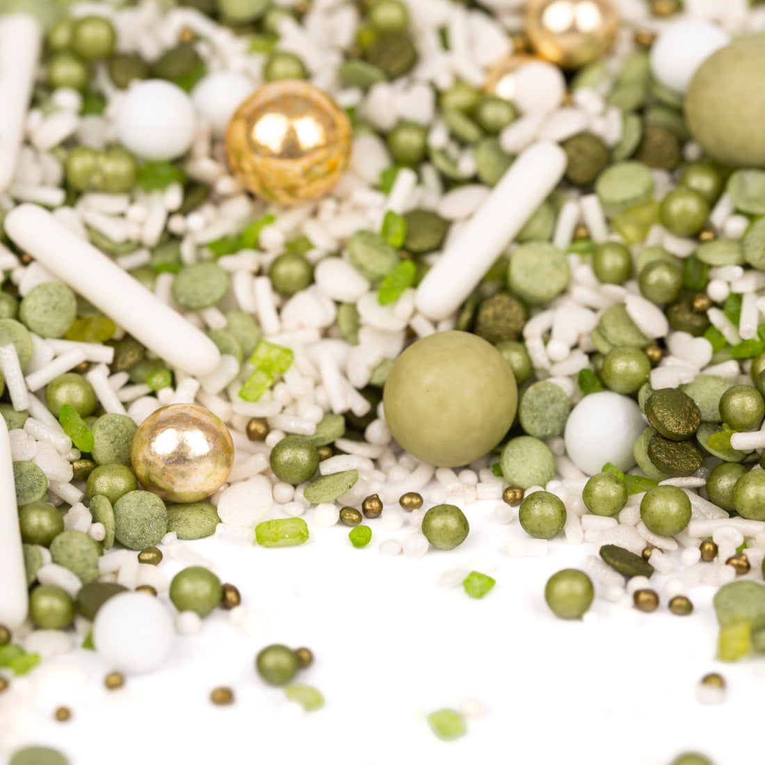 Heut ist so ein schöner Tag, lalalalala! Dieser StreuselMix ist wie ein Versprechen, denn jeder Tag mit diesem Mix wird: SoEinSchönerTag! Also perfekt für den großen Tag der Hochzeit oder einer Taufe. Und wenn du jeden Tag einen schönen Tag haben möchtest, dann musst du einfach nur jeden Tag diese himmlisch edlen Streuselchen auf Kuchen, Torten und Kekse streuseln. Oder auf deinen Milchschaum vom Kaffee. Oder auf dein Müsli. Die SchönerTagMacher: große Schokokugeln in Olive, kleine Schokokugeln in Weiß und Gold, dazu weiße Zuckersticks und Konfetti- sowie Kügelchenstreusel in Weiß und Olive. Was eine StreuselHarmonie – hach, zum Verliiiieben!