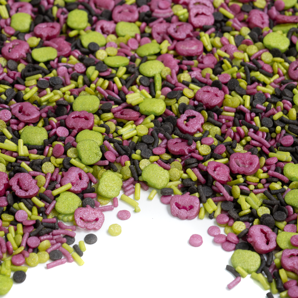 Huhu, huhu, wer spukt denn hier umher? SpukiSpuk findet keine Ruh, bis er dein HalloweenGebäck vergruselifiziert hat! Mit SpukiSpuk machst du jeden deiner Gäste auf der HalloweenParty garantiert superglücklich, denn ganz egal, ob vegan, glutenfrei, zuckerfrei oder laktosefrei – SpukiSpuk kann alles! Jetzt steht deinen schaurig schönen GruselTörtchen, glibberglubschi Nachspeisen und gespenstisch leckeren Muffins nichts mehr im Weg. Im StreuselMix verstecken sich grüne Kürbisse, Kürbisse mit Gruselfratze in Aubergine, sowie grüne, auberginefarbene und schwarze KonfettiStreusel.