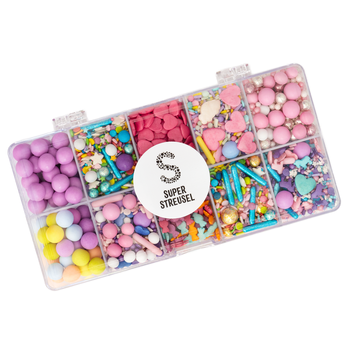 Einzelpreis 11,16 € pro 100gOha, Ladies! Das hier ist pure Mädchenmagie! Wir haben hier Super Streusel in der Superbox, pastelligzauberhaft, verwunschen hübsch und zauberschön. Sie steckt voller glimmerschimmerschöner Zuckerstreusel , zarten Schokokugeln und so viel Liebe, dass gleich Schnappatmung einsetzt.