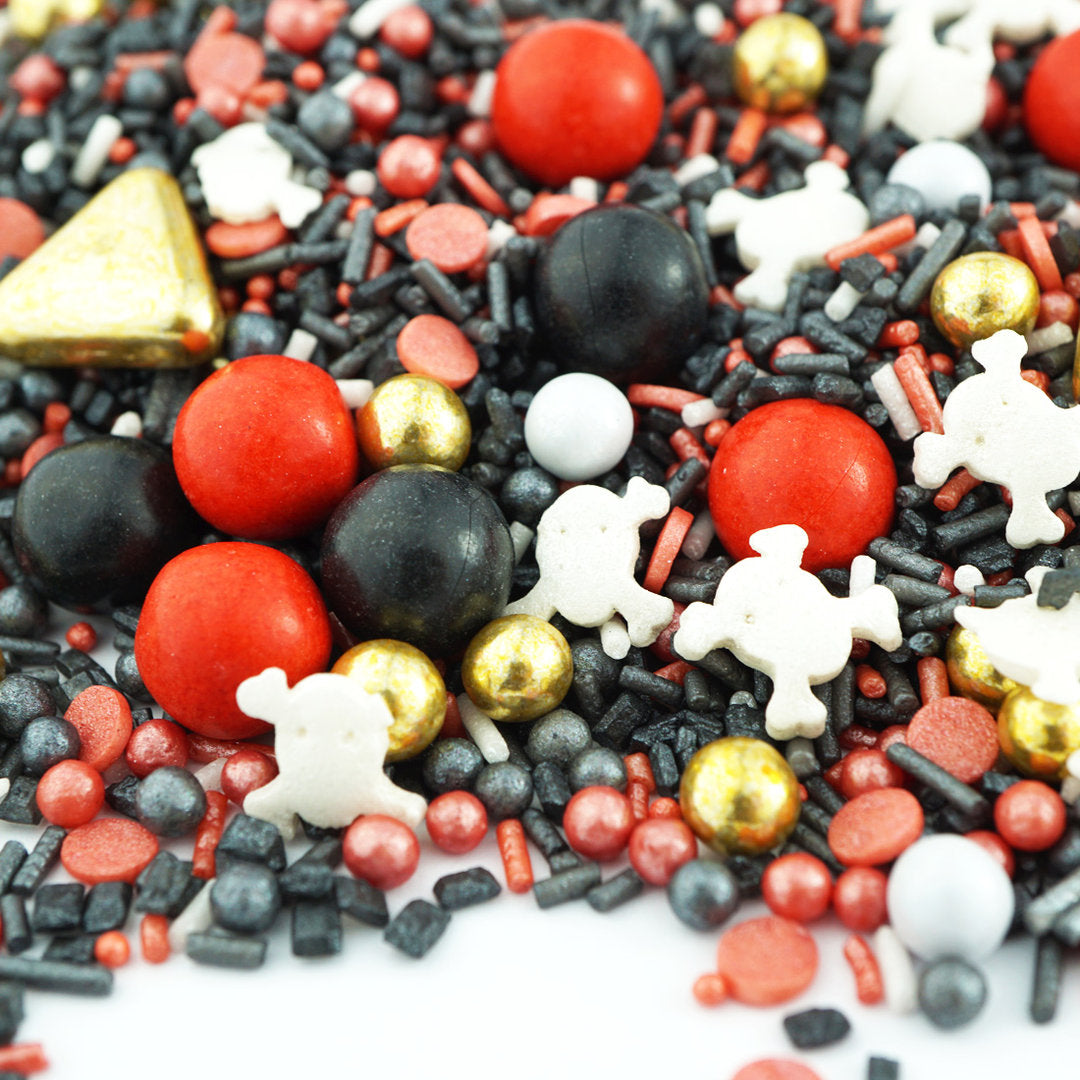 Augenklappen ab: Das hier ist der perfekte Mix für kleine Seeräuber, Schatzsucher und Piratenanwärter! Mit diesem bunten StreuselMix aus weißen Totenkopfstreuseln, roten, weißen und schwarzen Zuckerstreuseln, rotem Konfetti, Zuckerperlchen, großen roten und schwarzen zarten Schokokugeln steuert die Piratenparty mit Sicherheit in streuselige Gewässer. Und da zu jedem erfolgreichen Piratengeburtstags-Kuchen auch ein Goldschatz gehört, haben wir den StreuselMix noch mit goldenen Mini-Schokokugeln und goldenen Zuckerdreiecken gepimpt. Damit wird die Party ein Erfolg für alle Leichtmatrosen. SeefahrerEhrenwort!