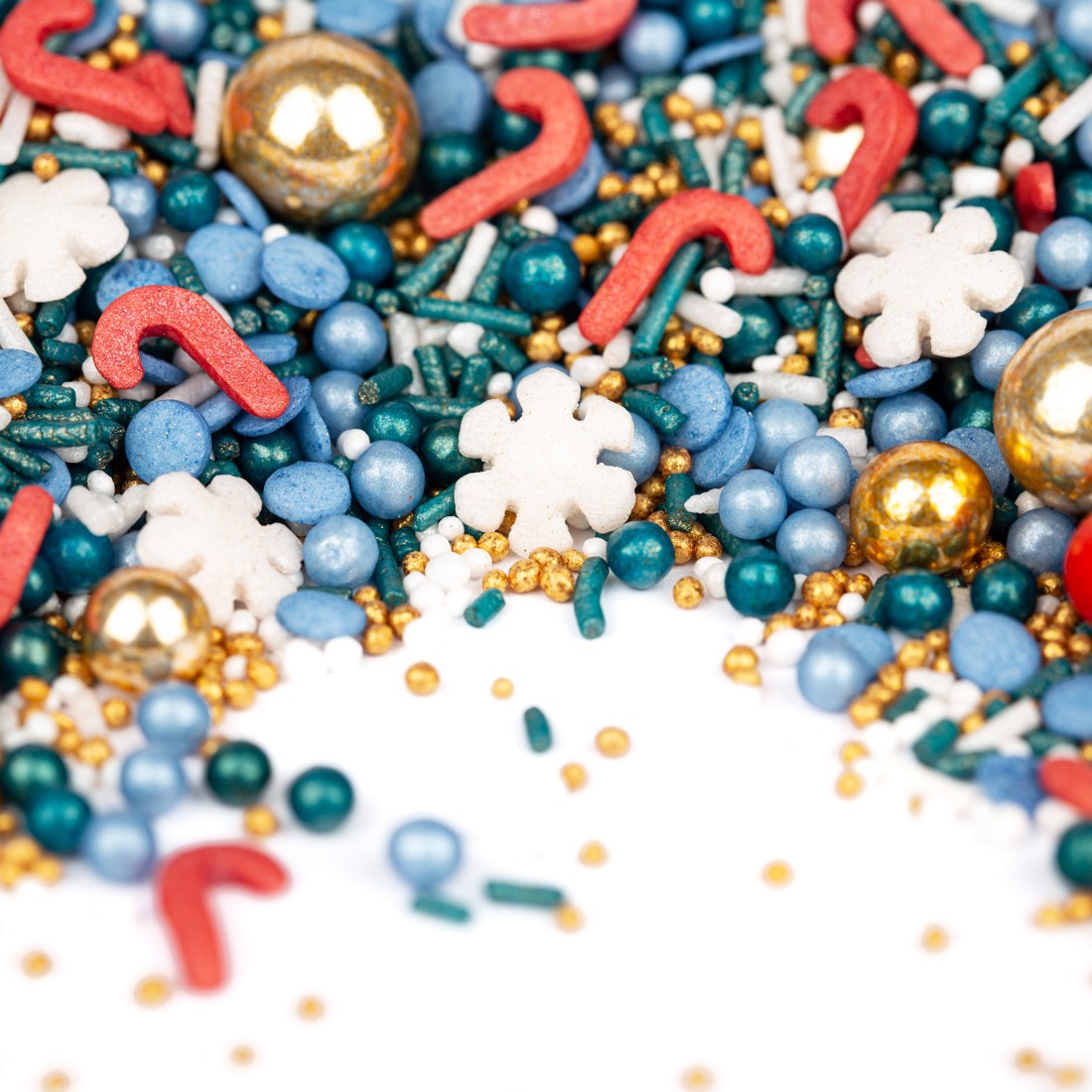 Herzlich Willkommen im streuseligen Winterwunderland! Da tanzen die Schneeflöckchen mit den Zuckerstängchen. Bei WeihnachtsWunder hatte neben Ross Antony garantiert auch das Christkind höchstpersönlich seine Finger im Spiel. In diesem Jahr wünscht es sich nämlich besonders stilvolle Weihnachten mit schickstem Gebäck. Von Tannengrün hat das Christkind erst mal die Nase voll. In diesem Jahr wird´s blau, rot, weiß und gold. Deshalb sind in WeihnachtsWunder weiße SchneeflockenStreusel, rote Zuckerstangen, goldene und rote Schokokugeln zusammen mit blauen Konfettistreuseln und petrolfarbenen KügelchenStreuseln.