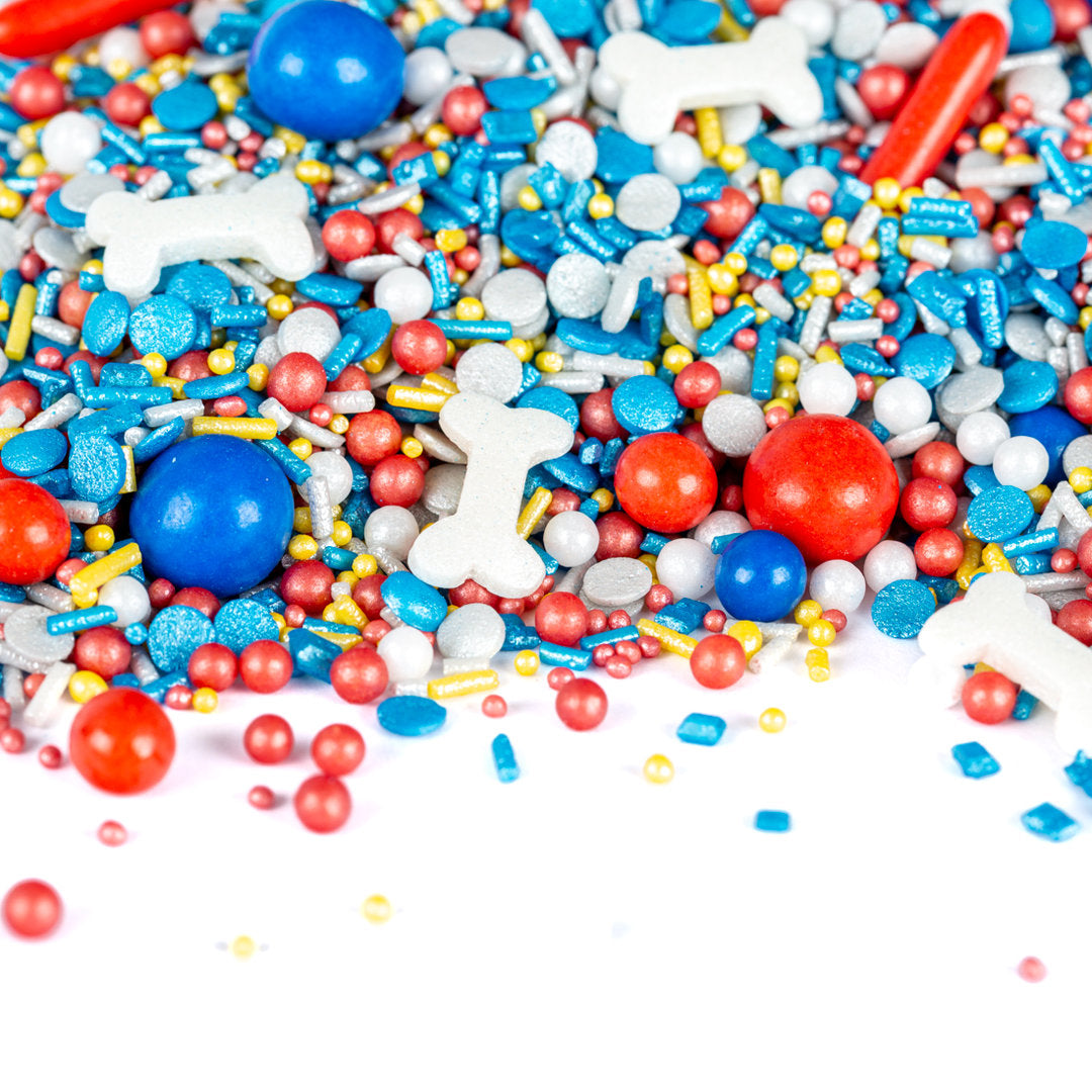 Das ist der StreuselMix für alle Freunde auf vier Pfoten! Der Mix mit den süßen KnochenStreuseln passt perfekt auf GeburtstagsTorten, GeburtstagsMuffins und GeburtstagsNachtische, vor allem wenn es sich beim GeburtstagsMotto rund um die süßen Vierbeiner dreht, die auf einer ganz besonderen Mission unterwegs sind. Blaue und weiße KonfettiStreusel, gelbe Nonpareilles und blaue und rote Schokokugeln machen diesen HundeStreuselMix zu einem deiner süßen PartyHighlights. Großartig für alle, die ihre Fellfreunde abgöttisch lieben.