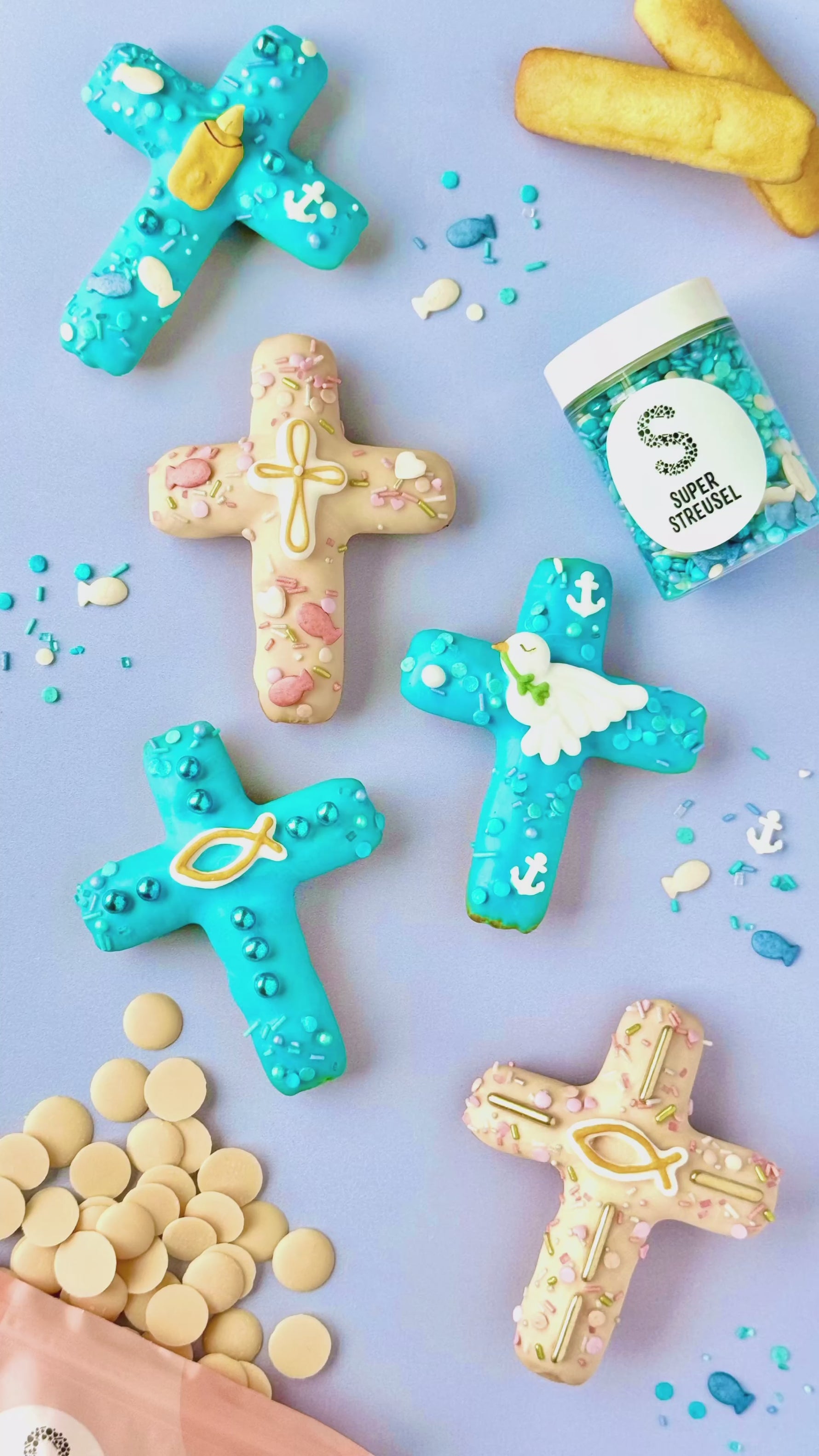 Die SuperDinger BesteFeste bestehen aus schicken Motiven in zartem Ocker, Mint und Weiß zu Taufe, Kommunion und Konfirmation: Zwei Tauben, vier Fische, zwei Kerzen, zwei Festbögen und zwei Kreuze.
