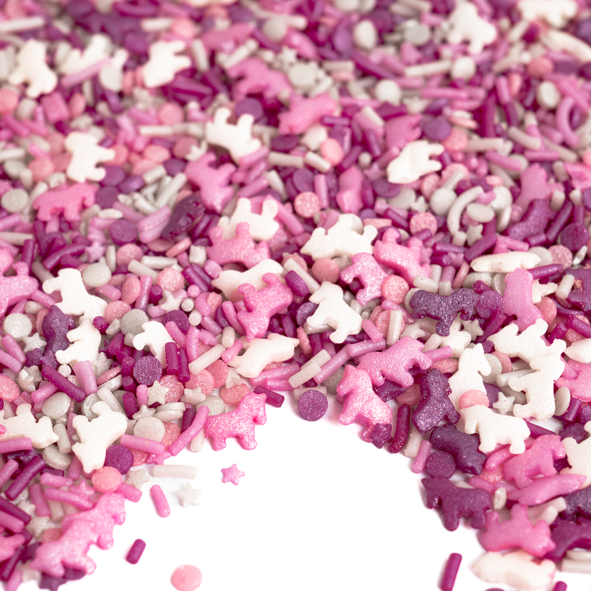 In SchimmerSchweif tummeln sich EinhornStreusel in Pink, Weiß und Lila sowie kleine SternchenStreusel und schimmerschöne KonfettiStreusel – perfekt für eine zuckerfreie Freude für den nächsten Kindergeburtstag, deine Motto-Party oder einfach für einen einhornstarken Tag.