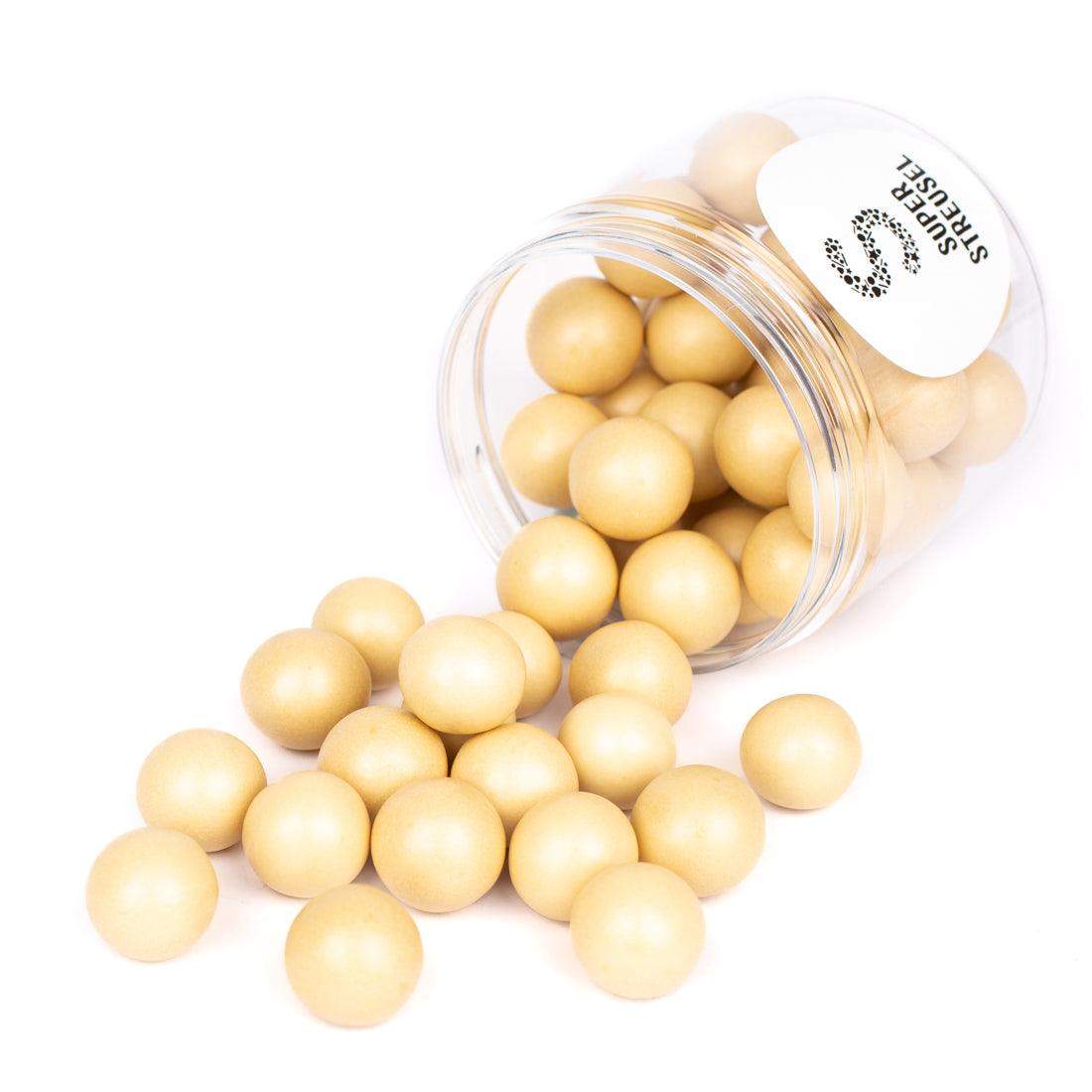 Für alle Hobbybäcker, die so richtig knusper in der Birne sind, sind das hier die ultimativen Super Streusel. Prall, groß, rund, perlmutt von außen uuund supercrunchy von innen! Unsere XL-Knusperkugeln haben einen super yummy Crunchkern, ummantelt mit zarter Schokolade. So eine Kugel (mehr als doppelt so groß wie unsere normalen Schokokugeln in den Mixen!) ist tatsächlich das i-Tüpfelchen auf deinem Cupcake oder Kuchen. Mehr Tüpfelchen für deine Backidee geht nicht!