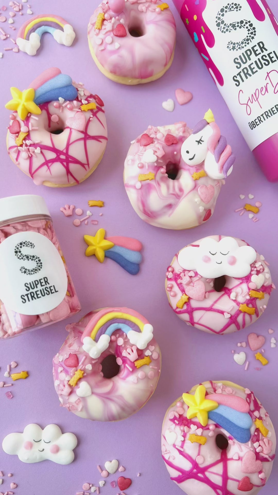Jedes SuperDing ist selbst designt, von Hand gespritzt und bemalt worden (jaaa, alles von Hand gemacht! Nix Maschine!). Die SuperDinger Regenbogenland heben deine Geburtstagstorte zur EinhornParty auf ein ganz neues Level. Willkommen im Land der Einhörner mit einem bunten Regenbogen, einer Sternschnuppe, fliegenden Herzchen, einem süßen Wölkchen, Sternchen und natürlich einem entzückenden Einhorn.