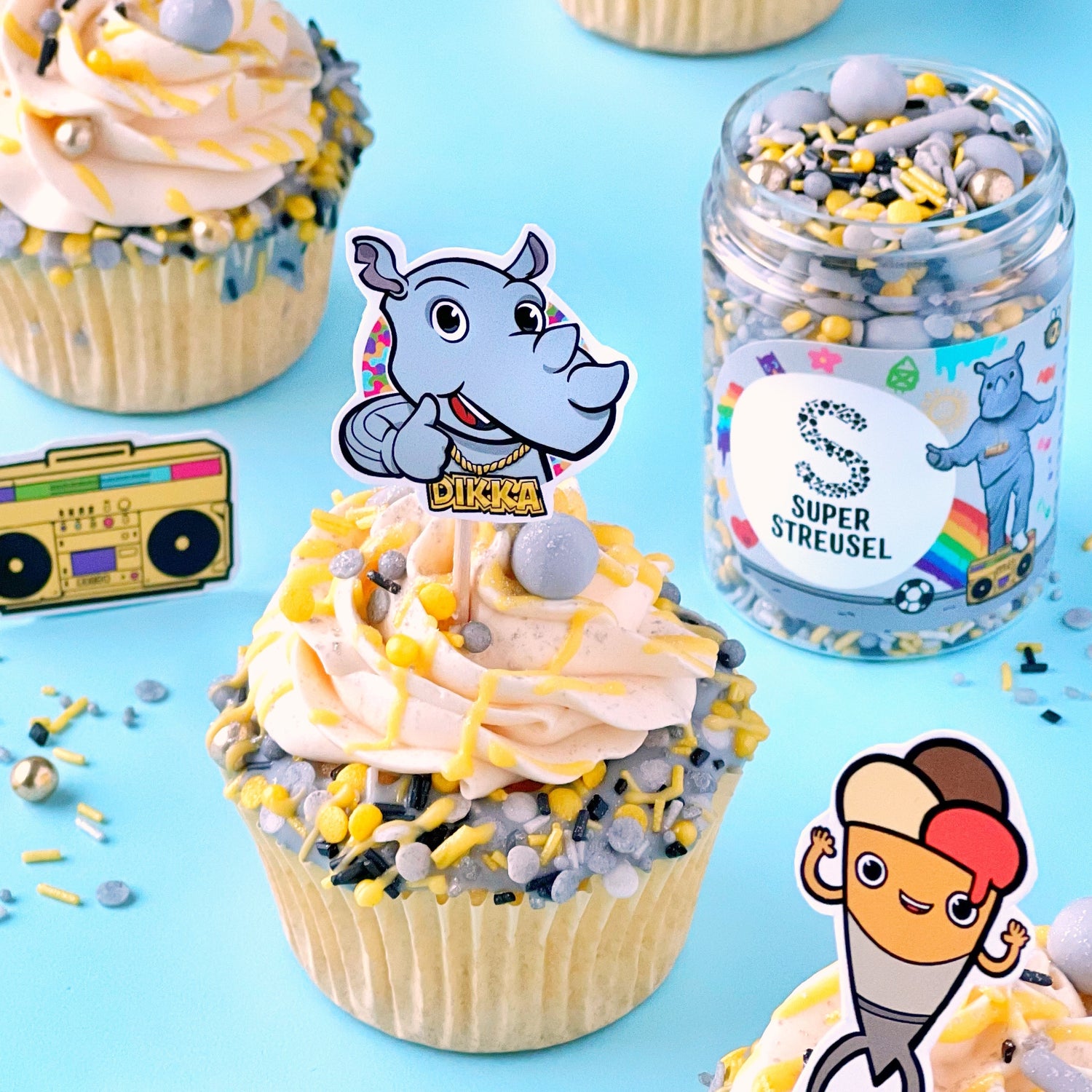 Oberhammermäßig nashornstarke News: Das rappende Nashorn DIKKA ist am Start und hat mit uns die allercoolste Super Streusel Kollektion kreiert. Oh yeah! Es gibt ein superkrasses Set, megacoole SuperDinger und natürlich einen wunderschönen StreuselMix. Schau sie dir an und pimp deinen Kuchen für die Kids jetzt lässig im DIKKA Style.