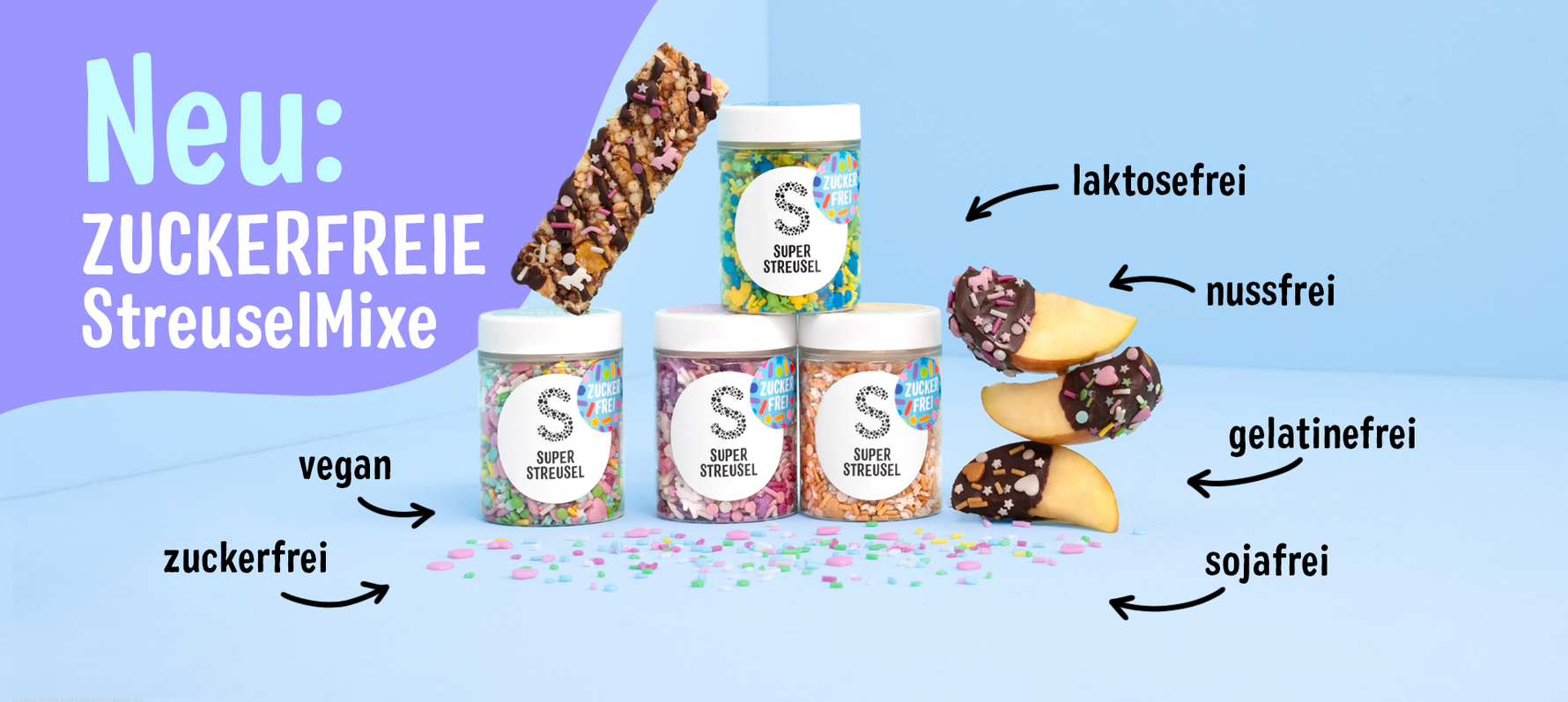 Unsere neuesten StreuselMixe sind nicht nur zuckerfrei, sondern auch vegan, laktosefrei, nussfrei und sojafrei – perfekt für alle, die süß dekorieren möchten, ohne auf bewussten Genuss zu verzichten. Ob für Kuchen, Cupcakes oder Kekse: Mit unseren zuckerfreien StreuselMixen zauberst du wunderschöne Kreationen, die genauso gut schmecken, wie sie aussehen. Lass dich inspirieren und probiere unsere leckeren Rezepte, die deine Backkünste auf das nächste Level bringen.