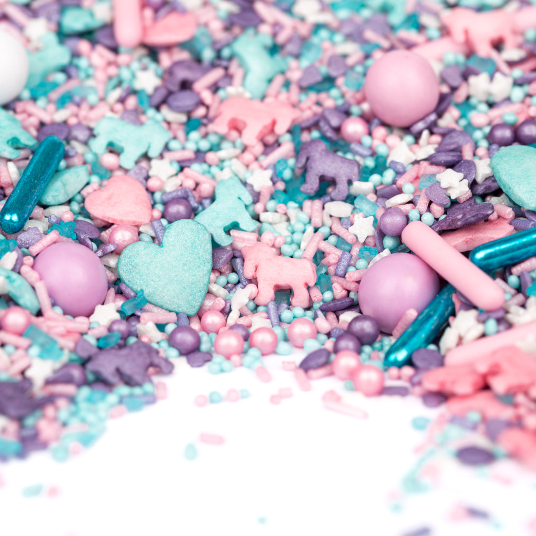 Ja richtig gesehen, es sind Einhörner!! Einhorn-Streusel in diesem pastelligen Traum an Streuselmix. Wir haben all die Einhornmagie, die wir finden konnten in diese Einhorn Kuchendeko gepackt, dabei an Feen, Zauberer und liebe Elfen gedacht...puffpuff... da war er geboren! Der Streuselmix, der dich und alle kleinen Mädchen in deiner Nähe zum kreischen bringt: "uuuuh, ist der süß" , "oooooh, der Mix ist ja wirklich Zucker!". Es kann auch zu spontanen Liebesbekundungen deiner Kinder kommen (so: "Maaaammmmaaaaa, dubistdieBesteichliebedichdankedankedankefürdentollstenSuperStreuselMixderWeltichwerdjetztimmermeinZimmeraufräumen!!!"). Neben den Einhorn-Streuseln in rosa, türkis und lila haben wir noch mehr MiniStreuselHerzen, RiesenHerzen, Konfettistreusel und glitzernde Zuckerstreusel dazu gemischt. Dazu eine ordentliche Portion fliederfarbene Schokokugeln und - der Kinderkracher schlechthin! - blaue und rosane Zuckersticks. Warum Kinder die so lieben? Innendrin ist eine dünne rohe Nudel, die mit Zucker ummantelt ist - der coolste Knabberspaß schlechthin! Also wie schon gesagt, wir haben ENDLOSE Einhornmagie in unseren EinhornParty-Mix gepackt. Also los, beeinhornsuperstreusel dein Leben!