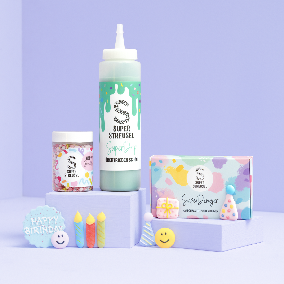 Geburtstag! Geschenke! Konfetti! Uuuuund wichtigstes Element auf dem GeburtstagsTisch: Kuchen, Muffins oder Torte kunterbunt dekoriert mit StreuselMix HochSollstDuLeben, SuperDrip Türkis und SuperDingern HippHippHurra. Wir sind ja eh fest davon überzeugt, dass jawohl JEDES Geburtstagskind (egal ob groß oder klein) einen hübsch dekorierten Geburtstagskuchen verdient hat. Mit unserem GeburtstagsSet hast du alles, was du dafür brauchst, um den schönsten aller Geburtstagskuchen für eine geliebte Person zu dekorieren.