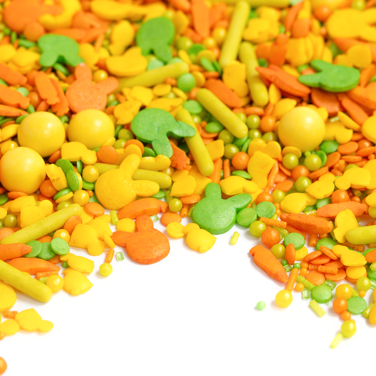 Karotten gehören zu Ostern wie der Osterhase höchstpersönlich, was darf also nicht fehlen? Ja. KarottenStreusel im Super Streusel Mix!! Aber das ist noch nicht alles, denn ja, der Osterhase schaut wirklich höchstpersönlich vorbei und zeigt sein hübsches Gesicht in Form von süßen HasenKopfStreuselchen in Orange, Grün und Gelb. Seine Freundchen die KükenStreusel hat er auch mitgebracht und die quaken sich in Gelb durch diesen gelbgrünorange poppigen StreuselMix. Damit kannst du die köstlichsten Karottenkuchen, HefeteigTeilchen und die buntesten Karottenmuffins zaubern. Auf geht’s, zeig der StreuselKarotte was in ihr steckt!