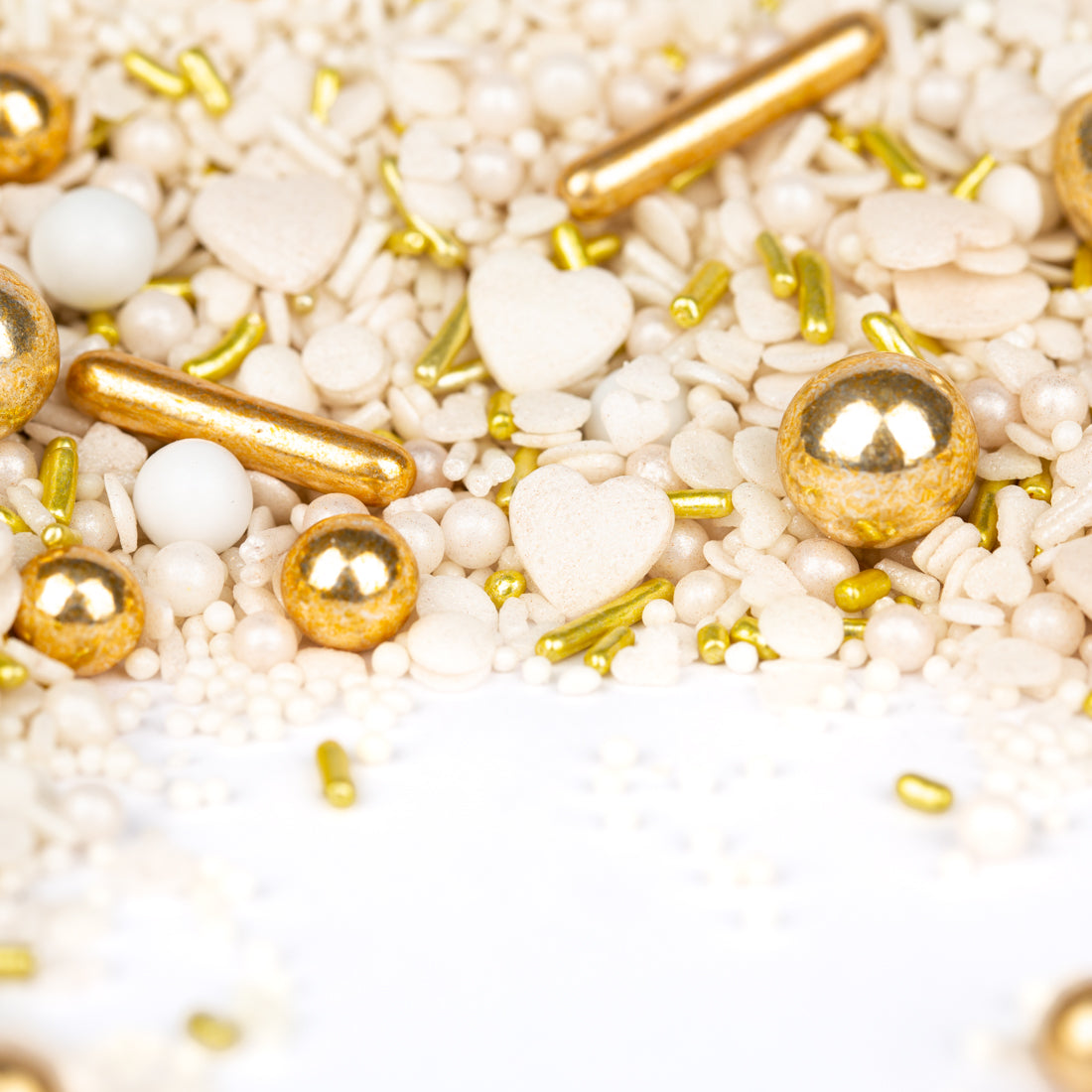 Würde die Münchner Schickeria Streusel statt Klunker um den Hals tragen, würden sich die Damen mit allerhöchster Wahrscheinlichkeit für diesen exklusiven High-Class-Mix entscheiden. Dicke Perlen und das auch noch in gold, dazu goldene Hochglanz-Streusel und diese tinitinymini-sternchen in güldener Anmutung, gepaart mit unschuldig daherkommenden superweißen Perlen, Konfettis und Schoko-Kügelchen - heieiei, zweifelsohne haben wir es hier mit einem Mix der Extraklasse zu tun. Diese famosen Zuckerstreusel eignet sich auch äußerst hervorragend für Hochzeiten, Jubiläen, die Weihnachtsbäckerei und andere jubeltrubelige Feierlichkeiten.