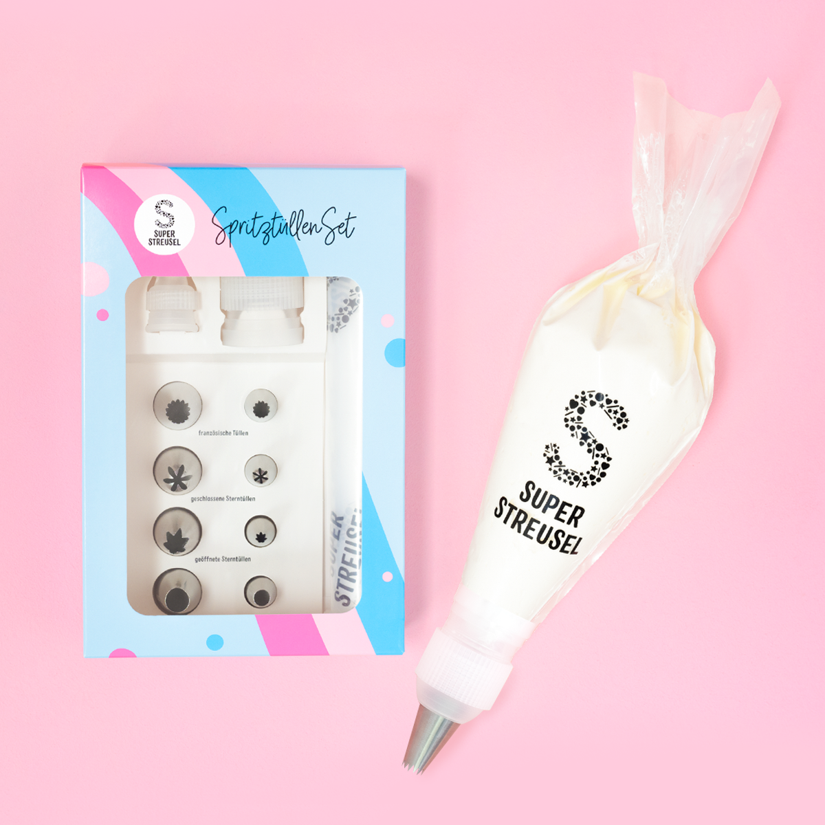 Zaubere die perfekten Tuffs auf deine Cupcakes, Torten und Gebäcke! Cremes, Sahne oder Teige ganz einfach mit 8 verschiedenen Spritztüllen aufspritzen. Sterne, Kringel, Blümchen - alles kein Problem! Dank cleverer Adapter kannst du deine Tüllen ganz einfach wechseln, ohne den Spritzbeutel vorher auszuleeren. Jetzt nur noch Super Streusel drauf und woooow!