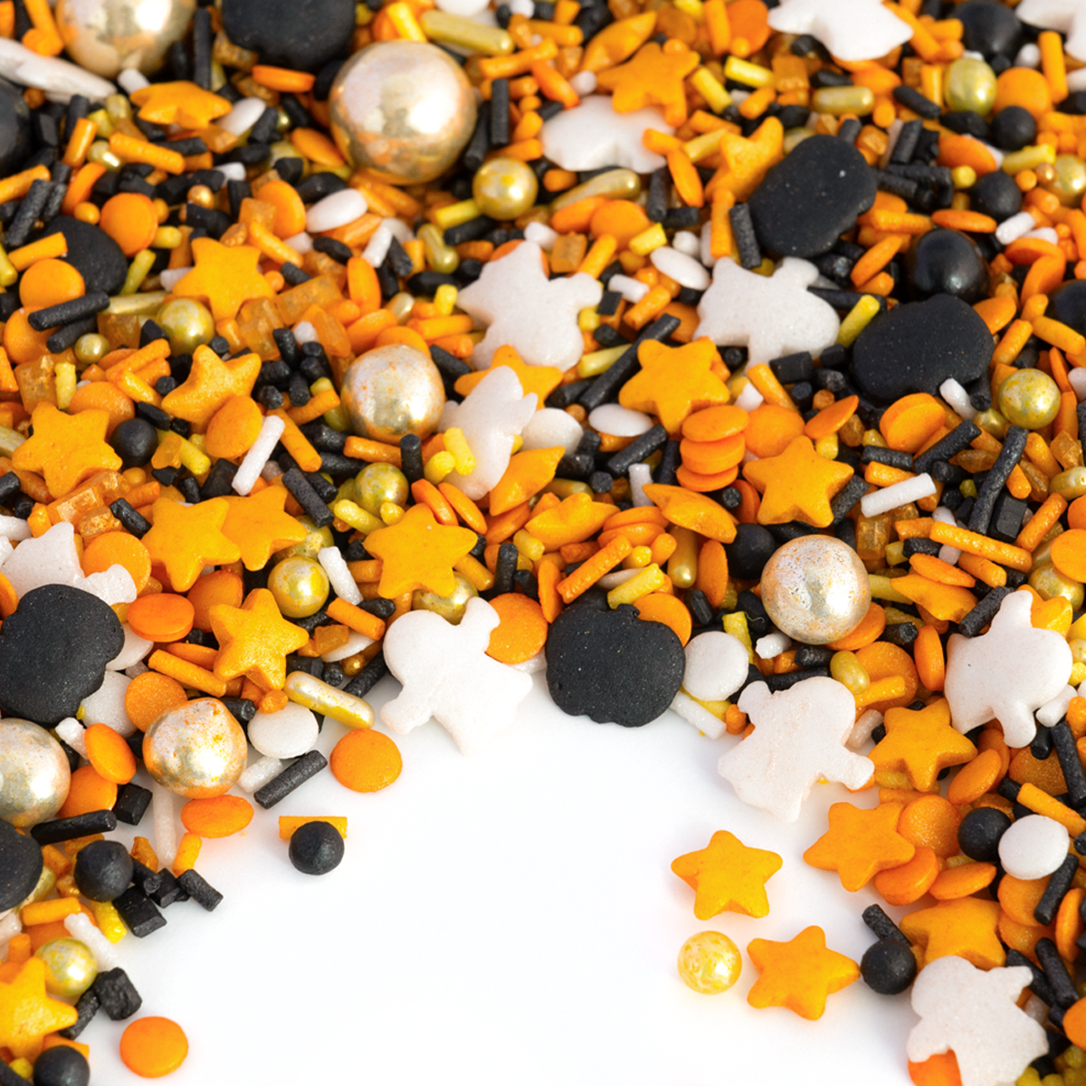 StreuselMix SpukSpektakel bringt alles mit für deine perfekte Spukshow: Geister in strahlendem Weiß und Kürbisse in tiefem Schwarz, dazu edle schwarze und goldene Schokokugeln, kleine MiniKnusperkugeln in Schwarz und Gold, funkelnde gelbe Sterne, ein Schwung Zuckerstreusel und KonfettiStreusel in Gelb, Gold, Schwarz und Weiß – handvermischt und bereit für den großen Auftritt.