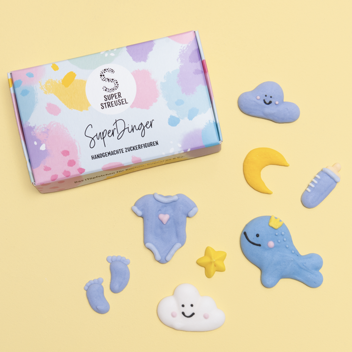 Jedes SuperDing ist selbst designt, von Hand gespritzt und bemalt worden (jaaa, alles von Hand gemacht! Nix Maschine!). Im Set KleinesWunder warten ein blauer Wal, ein niedlicher Strampler, ein Babyfläschchen, zwei Wölkchen, ein Mond, ein Sternchen und zwei süße Babyfüßchen darauf, deine Cupcakes zur Babyshower oder deine Torte zur Gender Reveal Party zu verschönern.